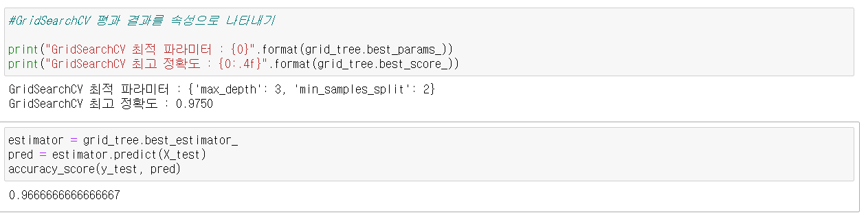 3. best_estimator : GridSearchCV의 refit값이 True일 때 최적 하이퍼파라미터로 학습한 estimator가