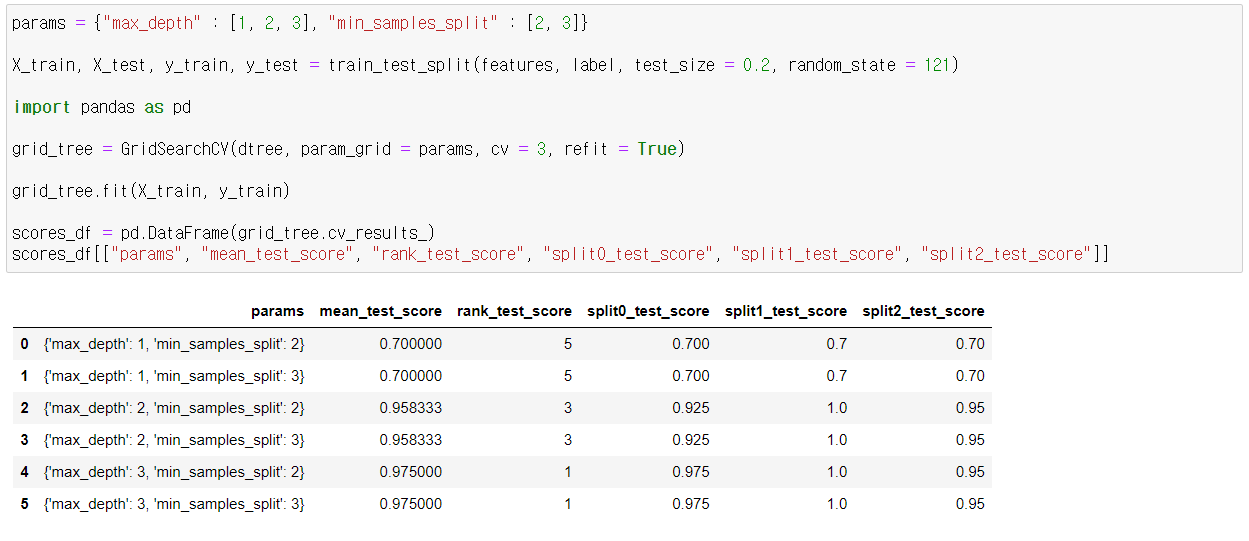 위 params에 정리된 하이퍼 파라미터들의 경우의 수에 따라 6가지 조합이 나오고, 각 조합마다의 교차 검증(cv = 3)을 하여 평균 정확도(설정된 score)를 계산합니다. 위의 경우 4번 5번 행의 조합이 공동 1위이고, 이 때 평균 검증 정확도는 0.975로 계산되었습니다.