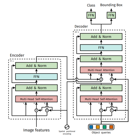Object query는 object query feature와 object query positional embedding으로 구성되어 있다. feature는 decoder에 Initial input으로 사용되어 decoder layer를 거쳐 학습된다. positional embedding은 decoder layer의 attention 연산 시 모든 feature에 더해진다. feature는 학습 시작 시 0으로 초기화되며, positional embedding은 학습 가능하다. 이러한 object queries는 길이가 N으로, decoder에 의해 output embedding으로 변환되어 이후 FFN을 통해 독립적으로 box coordinate와 class label로 decode된다. 이는 각각의 query가 하나의 객체를 예측하는 region proposal에 대응된다고 볼 수 있다. 즉 object queries는 N개의 객체를 예측하기 위한 일종의 prior knowledge로도 볼 수 있다.