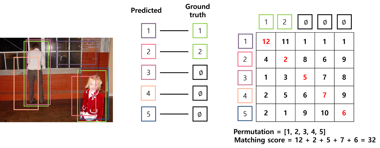 위 예시에서는 두 사람(객체)를 detection할 떄, 예측된 bbox를 gt와 매칭시키는 문제이다. 이 때 각 예측된 bbox를 gt에 매칭시킬 경우의 모든 cost는 오른쪽 행렬과 같다. 가운데 그림처럼 1대1 대응이 될 경우의 총 cost는 32이다.
