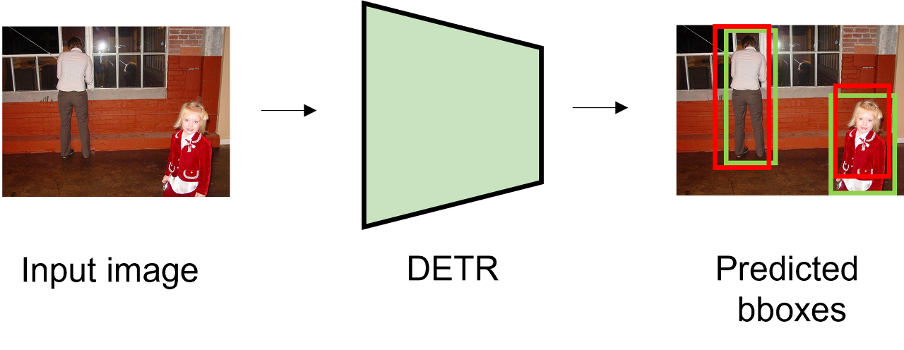 반면 DETR은 위 그림처럼 직접 정의한 hand-crafted anchor를 사용하지 않는다. 또한 하나의 gt에 하나의 bbox를 매칭시킨다. 이를 통해 예측된 bbox와 gt의 관계가 one-to-one이 되며 후처리 과정이 필요하지 않게 된다.