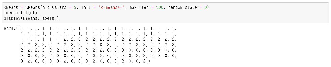 3개의 군집 중심점(군집 개수), k-means++로 초기 중심점 좌표설정, 최대 반복 횟수 300으로 설정해주었고, labels_ 속성을 통해 군집 레이블을 도출하였습니다.