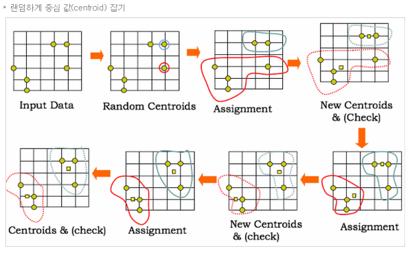 위 사진처럼 임의의 점에서 가까운 점들을 군집화하고 그 군집의 중심점을 찾아 그 중심점에 가까운 점들을 다시 군집화하는 순서를 거쳐 중심점을 이동했는데 데이터의 중심점 소속 변경이 없어질 때 군집화를 종료합니다.