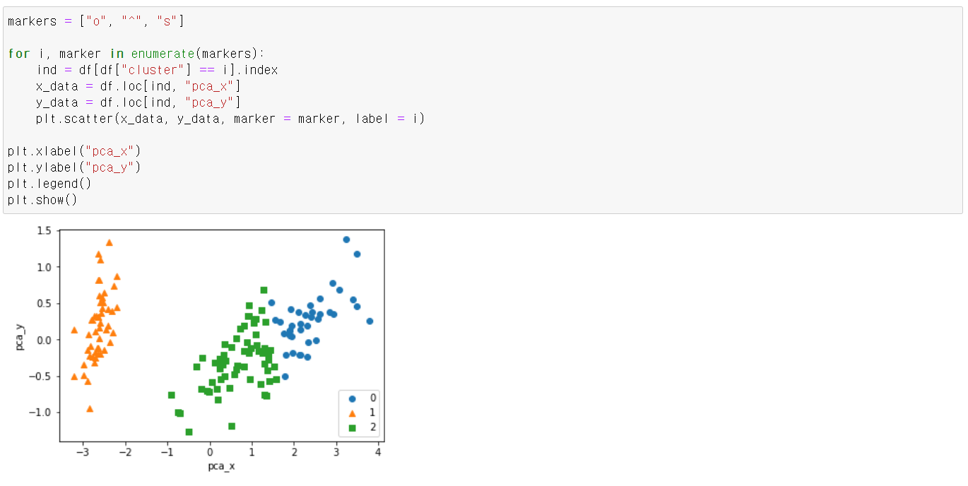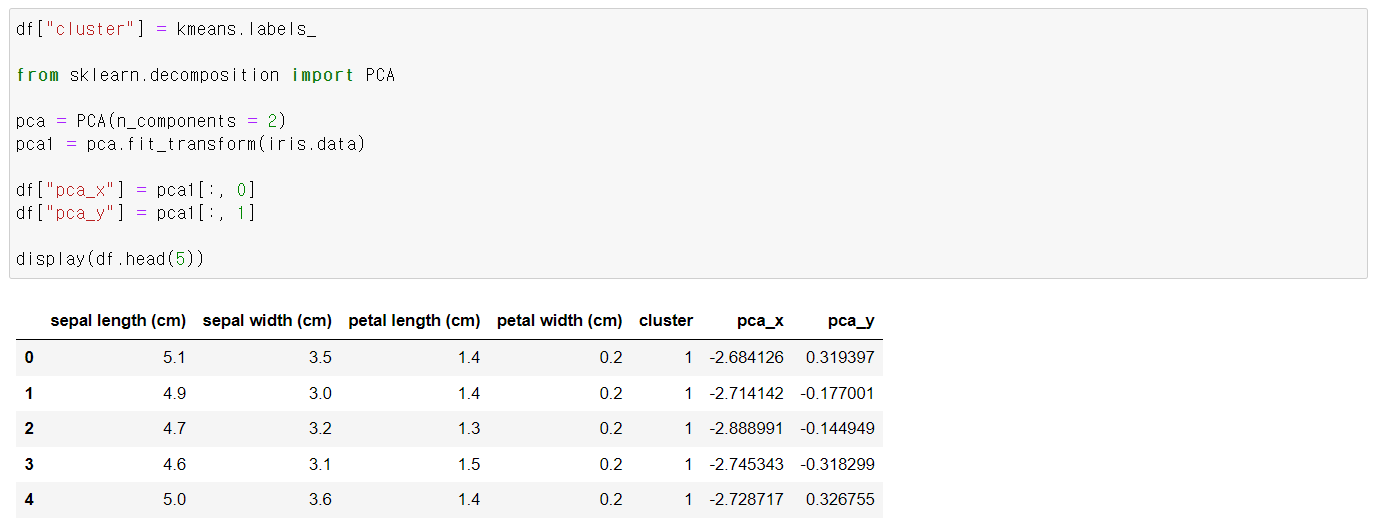 pca를 사용하여 두 개의 피쳐를 만들고, 이 속성에 따라 군집화가 잘 되었나 확인해보겠습니다.