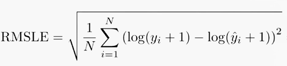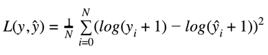 MSE에 로그를 적용해준 지표입니다. log(y)가 아니라 log(y+1)입니다. y=0일 때, log(y)는 마이너스 무한대이므로 이를 보정해주기 위해 +1을 한 것입니다.