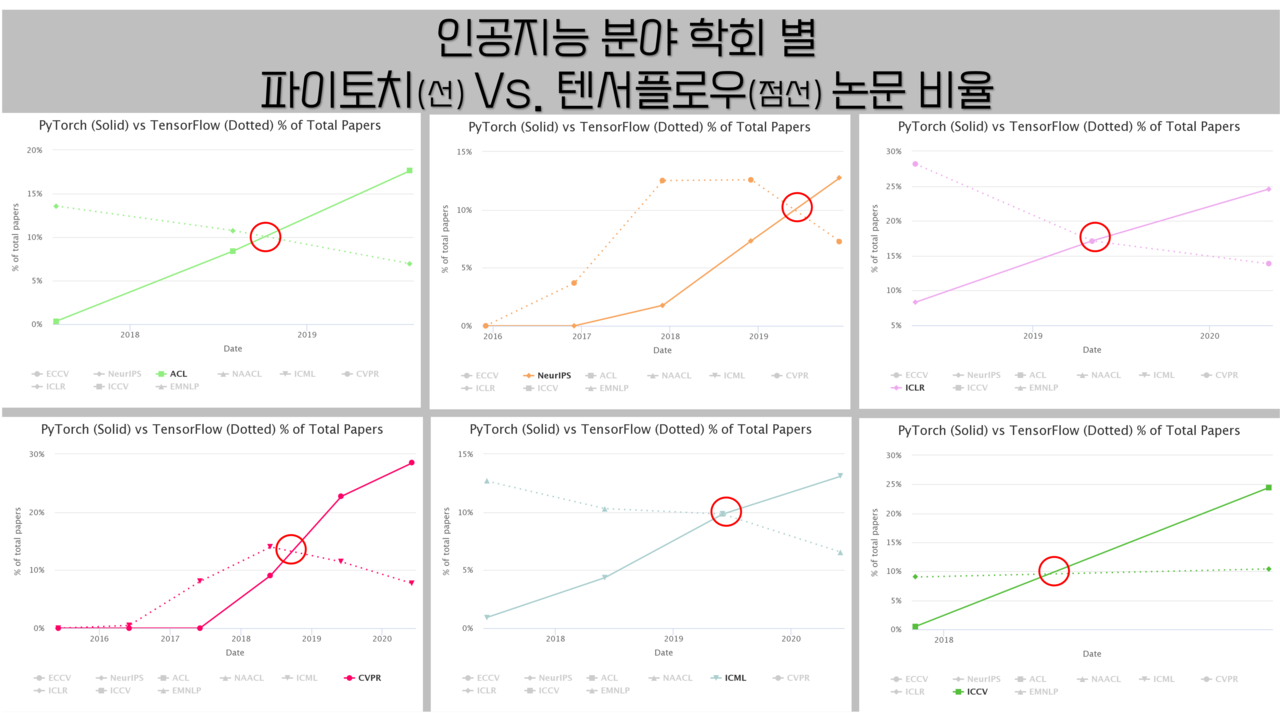 파이썬에는 텐서플로, 파이토치라는 프레임워크가 존재합니다. 파이토치는 텐서플로에 비해 코드가 직관적이고 디버깅이 상대적으로 쉬우며 코드 커스텀이 쉽다는 점에서 많은 관심을 받게 되었습니다. 위 그림을 보면 인공지능과 관련된 논문에서 파이토치로 구현된 경우가 계속 증가하는 것을 알 수 있습니다.