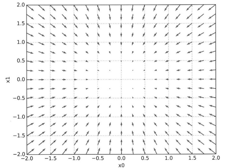이처럼 함수에 대해 모든 변수의 편미분을 벡터로 정리한 것을 기울기gradient라고 합니다. 위 그래프의 특정 값들에 대해 기울기를 구해 마이너스를 붙인 뒤, 그 벡터들을 2차원상에서 표현하면 다음과 같습니다.