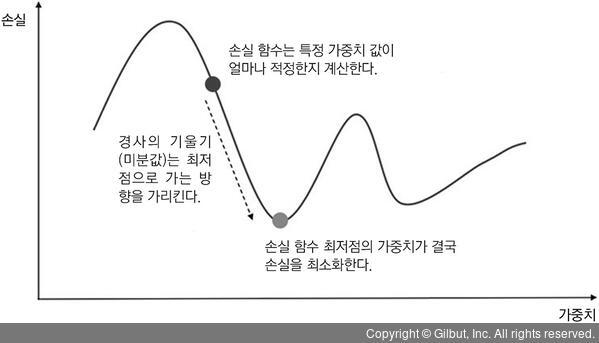 신경망 모델에서는 가중치를 대입해 손실함수값을 계산하고, 이에 따라 가중치를 업데이트합니다. 위 그래프는 모든 가중치를 대입해봐야 나올 수 있는 그래프입니다. 한 가중치 조합을 대입했을 때 우리는 위 그래프의 한 점을 알 수 있는 것이고, 그 점의 미분값을 통해 경사를 따라 내려가 최저점으로 가는 방향으로 가중치를 업데이트하는 것입니다. 이 때 경사를 따라 내려가 손실함수 최저점을 찾는 법을 경사 하강법이라고 합니다.