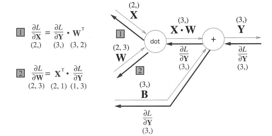 모든 입력값을 X라는 행렬에, 모든 가중치값을 W에 포함시켰을 때 Affine변환은 위 그림과 같이 표현할 수 있고, 이의 역전파는 다음과 같습니다.