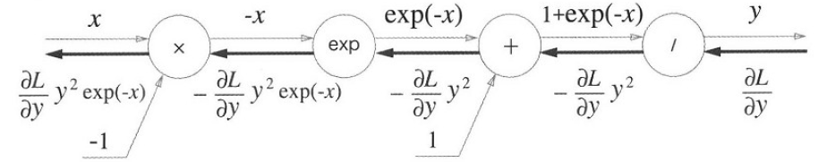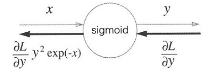 지수함수의 경우 미분을 할 경우 자신 그대로 이기 때문에, 이전(역전파 순서) 층에 출력된 지수함수값을 그대로 곱해주는 과정을 더합니다. 이 과정들을 단순화해서 나타낸다면 다음과 같습니다.