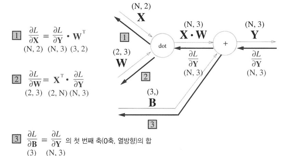 배치용 Affine변환에서는 입력값의 행 그리고 그 행차원으로 이뤄지는 미분식이 배치의 크기 N을 따른 다는 것을 생각하면 다음 그림의 이해가 쉽습니다.