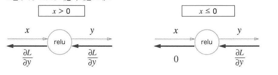 순전파 때 입력값이 0 초과면 역전파에서 그대로, 입력값이 0이하였으면 역전파 때 0으로 계산됩니다.