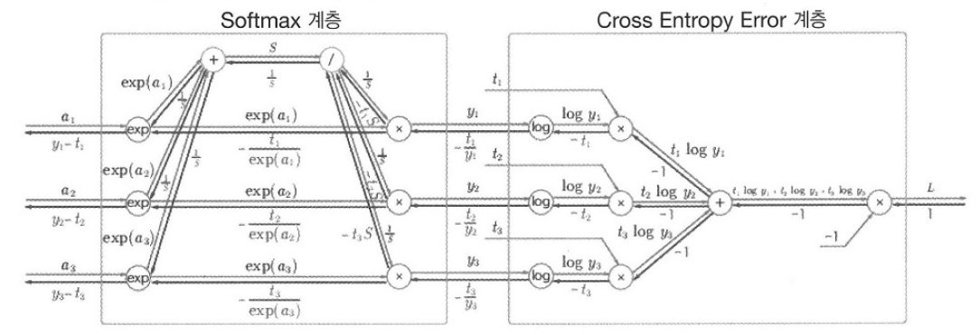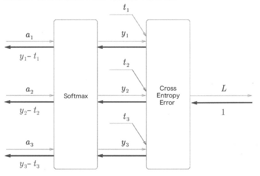 Softmax함수를 출력층의 활성화함수로 사용하고, 손실함수로 교차 엔트로파 오차를 사용했을 경우 손실함수에서부터의 오차역전파를 그림으로 나타내면 다음과 같습니다.