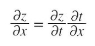 우변의 t가 지워져 좌변과 같아지는 것을 알 수 있습니다. 여기서 우변의 두 분수는 z를 t로 미분한 것과 t를 x로 미분한 것입니다. 이것은 x -> t -> z의 과정을 거치는 함수를 거슬러(z -> t -> x) 올라가며 이전(역전파 순서) 층의 값을 현재 층의 변수로 미분해준 것들을 곱한 것과 같습니다.