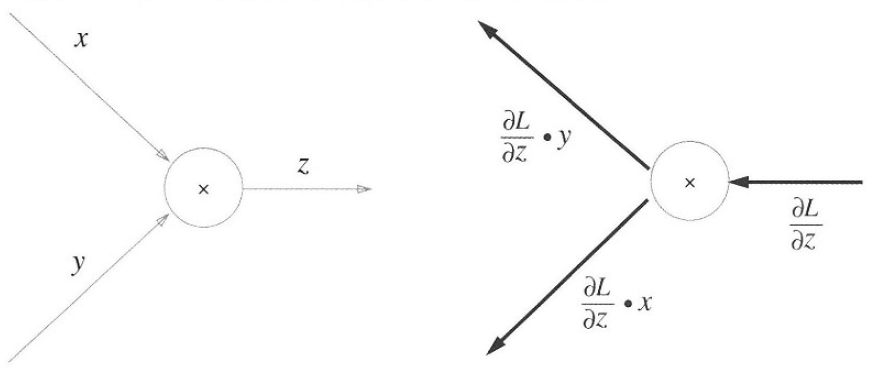곱셈의 역전파는 순전파 때의 입력신호들을 "서로 바꾼 값"을 곱하는 것과 같습니다.
