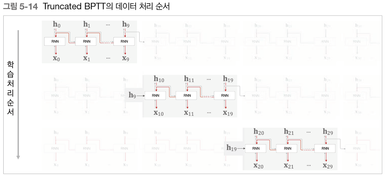 그런데 이 시계열 데이터의 시간 크기가 커지면, BPTT과정에서 연산량이 많아집니다. 따라서 큰 시계열 데이터를 취급할 때는 신경망의 연결을 적당한 길이로 끊어 오차역전파법을 수행합니다. 이를 Truncated BPTT라고 합니다.