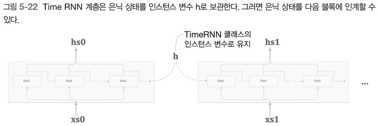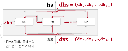 RNN t개 분의 작업을 한꺼번에 처리하는 계층을 Time RNN이라고 합니다(첫번째 그림 속 사각형). Time RNN계층을 하나의 층으로 생각했을 때, 각 층마다 나온 h는 인스턴스 변수로 유지합니다.