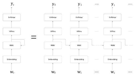 t는 각 단어의 순서를 기준으로 인덱싱 한 숫자입니다. 우변을 좌변처럼 하나의 계층으로 본다면 RNN으로 표시된 사각형의 층을 지나서 나온 output이 계속해서 다시 RNN계층으로 들어가게 됩니다. 따라서 값이 계속 순환하고 있습니다!