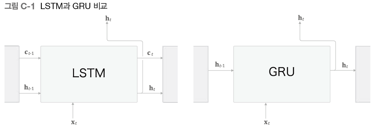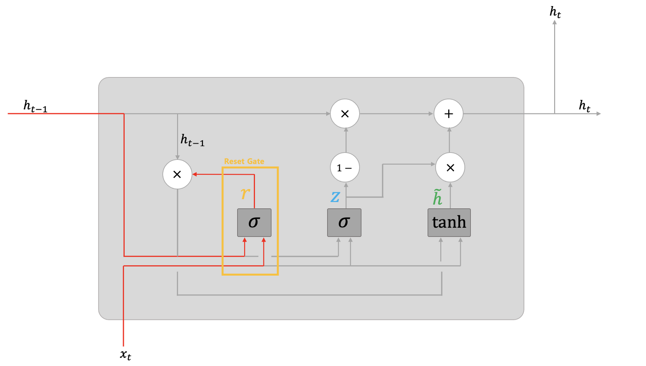 LSTM과 비교해보면, 기억 셀을 사용하지 않고 은닉 상태만을 사용합니다. 게이트를 추가하기 전까진, 기본적인 RNN과 같은 모습입니다.