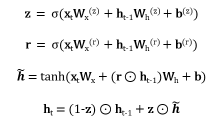 GRU에는 r과 z라는 두 개의 게이트를 사용하는데 r은 reset, z는 update게이트입니다. LSTM에 비해 게이트 수가 줄었고, 기억 셀을 사용하지 않는다는 점에서 파라미터 수와 연산량이 확실히 줄 것 같다는 생각입니다! 그리고 reset과 update라는 정말 필요한 게이트만을 설정해준 느낌입니다.