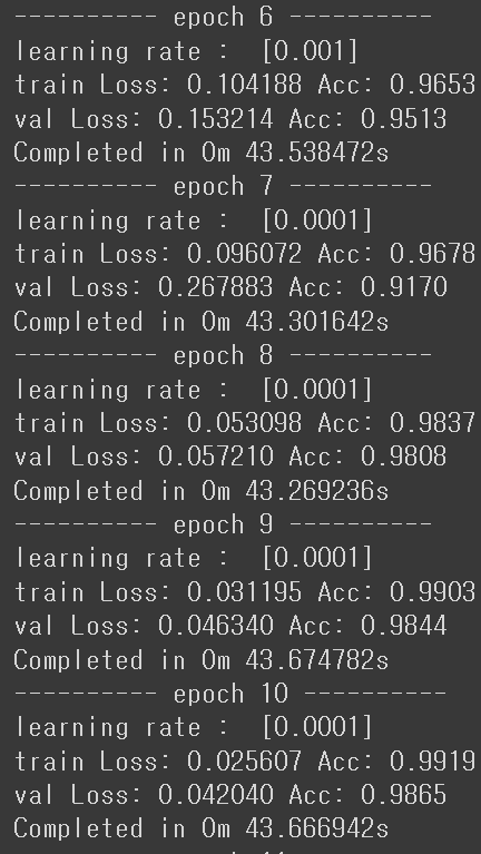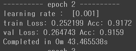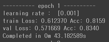 epoch_loss = running_loss/dataset_sizes[phase] # 전체 데이터 loss합을 각 데이터셋 전체 크기로 나눠주어 loss계산