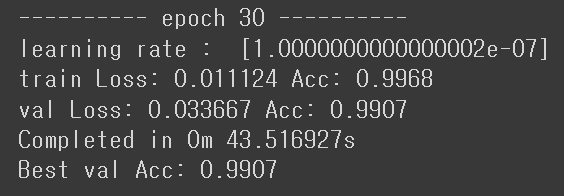 epoch을 30으로 늘린 결과 val 정확도가 99%까지 증가