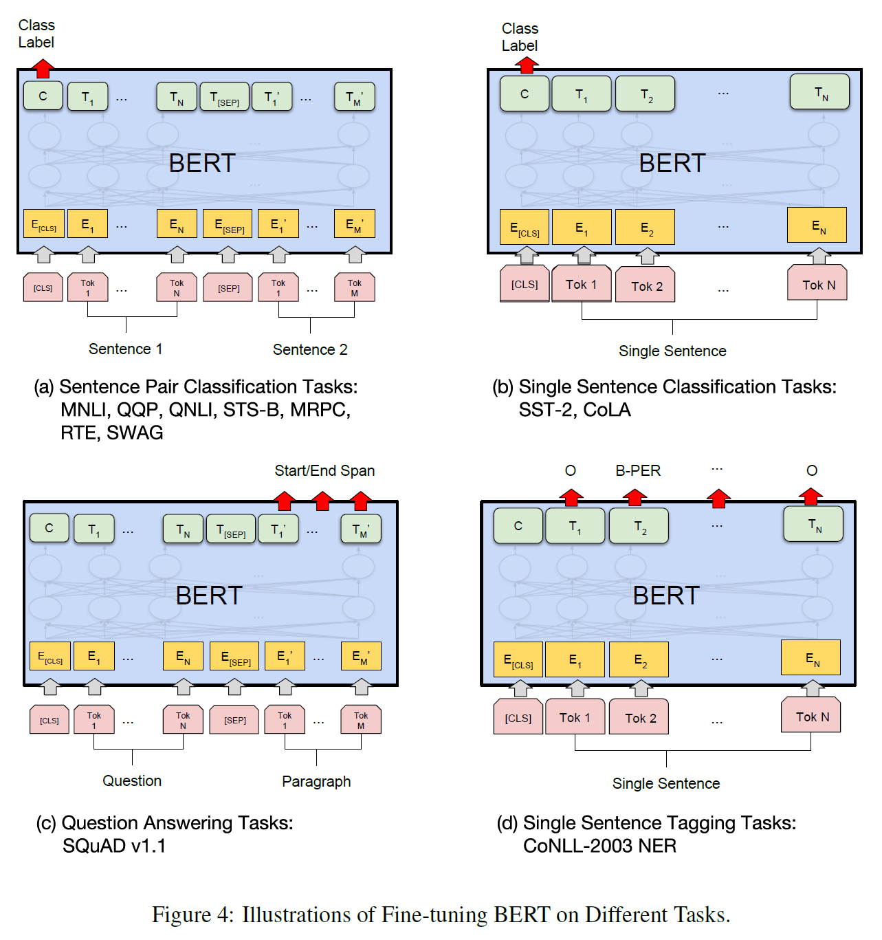 a, b는 sequence-level-task, c,d는 token-level task다. a, b같은 경우 classification task이기 떄문에 CLS가 output으로 사용된다. c는 QA task로 SEP 이후에서 start-end span을 찾도록 한다. d는 각 토큰에 대한 tagging 작업을 하는 task이다.