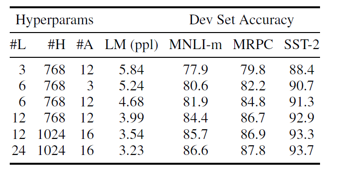 이 논문에서 Transformer block의 개수를 L, hidden size를 H, self-attention head 개수를 A로 표시한다. 또한 본 논문에서는 BERT(base)(L=12, H=768, A=12, Total Parameters=110M)와 BERT(LARGE) (L=24, H=1024, A = 16, Total Parametes = 340 ) 이렇게 두 개 사이즈의 모델을 결과로서 주로 기록한다.