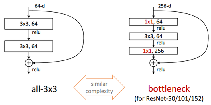 - Bottleneck 사용 O : (1×1×64)+(3×3×64)+(1×1×256)=896 (약 22% 절감)