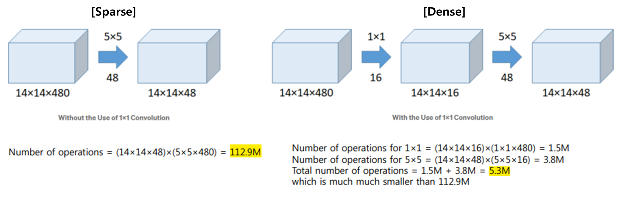 # Inception module에서 1x1 conv연산 후 5x5 conv연산 sequential