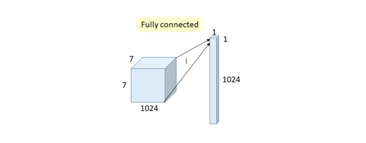 Global Average Pooling은 이전 계층의 output이 7X7X1024일 때, 채널별 feature map의 특징값들을 평균하여 1024개의 값을 만들어내고, 이를 바로 출력노드에 연결시킨다. 이 경우 평균이라는 계산을 통해 파라미터 수가 0이 된다.