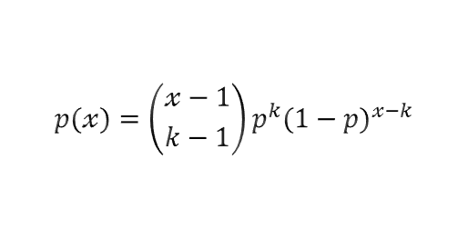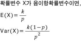 성공의 확률이 p인 베르누이 시행을 독립적으로 반복 시행할 때 k번 성공할 때까지의 시행횟수를 확률변수 X로 하는 경우 성공할 때까지의시행횟수 k, 성공 확률 p를 모수로 갖는 음이항 분포를 따른다.