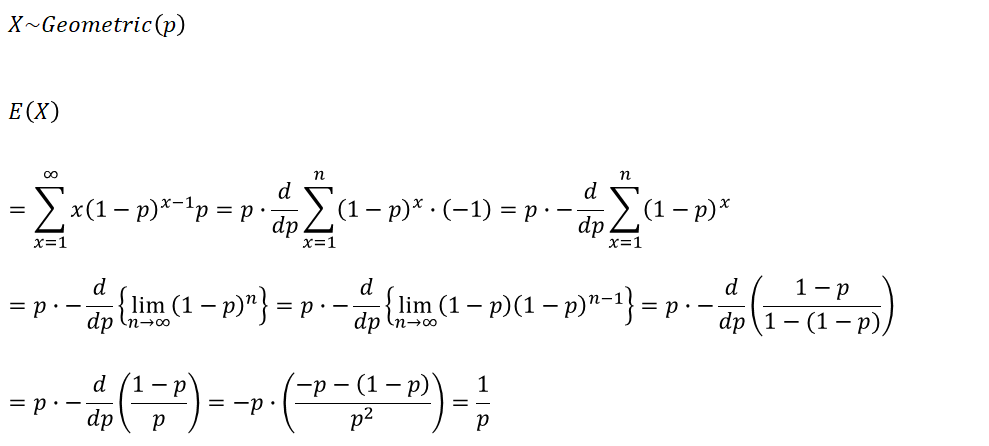 성공 확률이 p인 베르누이 시행을 처음으로 성공할 때까지의 시행횟수를 확률변수 X라 하는 경우 확률변수 X는 성공 확률 p를 모수로 갖는 기하분포를 따른다.(음이항분포 k=1)