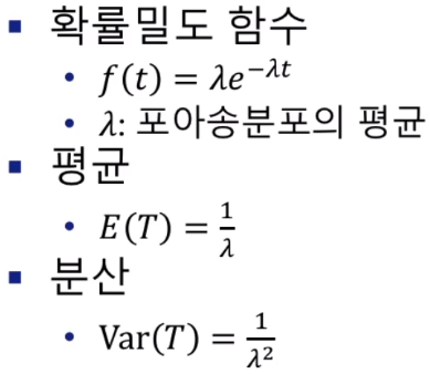 포아송 분포가 단위시간 내에서 발생하는 사건의 횟수(이산형!!)의 분포인 반면 지수분포는 한 번의 사건이 발생할 때까지 소요되는 시간(연속형!!)의 분포이다. 지수분포는 어떤 사건이 포아송 분포에 의해 발생될 때 지정된 시점으로부터 이 사건이 일어날 때까지 걸린 시간을 측정하는 확률분포로 확률변수 X는 한 번의 사건이 발생할 때까지 소요되는 시간이고 λ는 단위시간 동안 평균적으로 발생한 사건의 횟수이다.