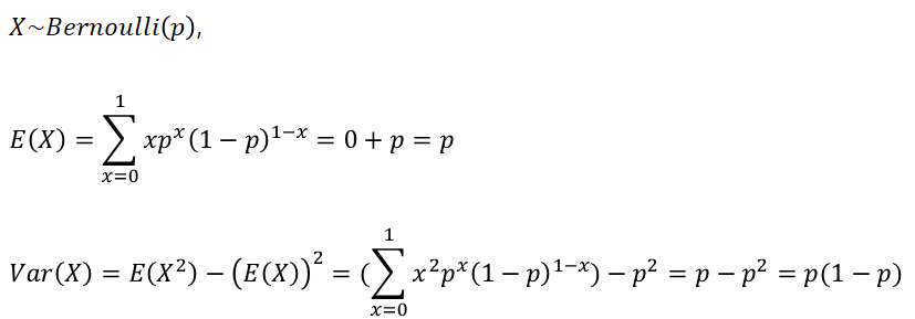 동등한 실험 조건 하에서 실험의 결과가 두 가지의 결과만을 가질 때 이러한 실험을 베르누이 시행이라하고, 이 때 성공의 횟수를 확률변수 X라 할 때 확률변수 X는 성공률이 p인 베르누이 분포를 따른다고 한다. (동전 던지기 시행)