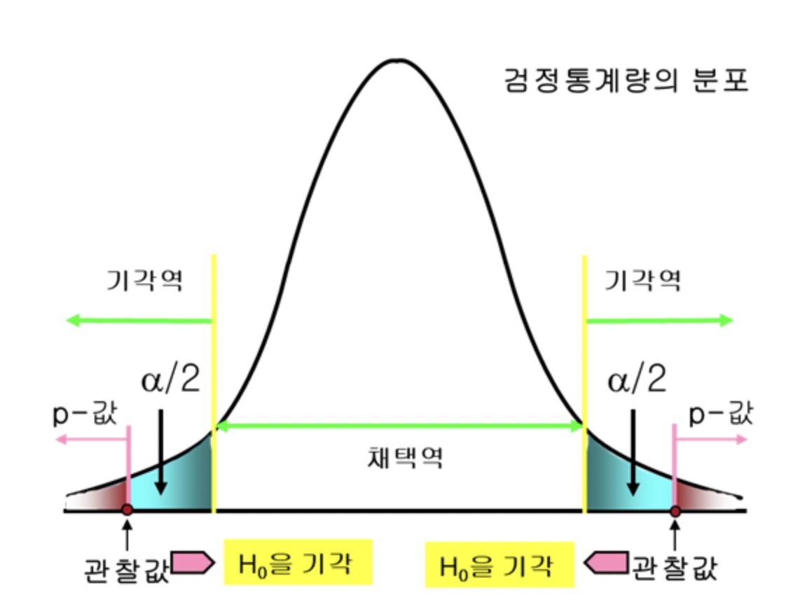 - p-value - 검정통계량을 확률분포에 대입시켰을 때, 해당 검정통계량이 나올 확률을 의미한다.