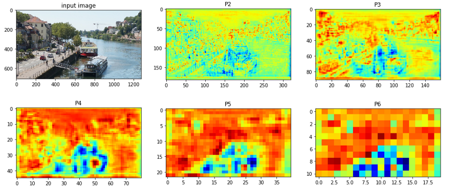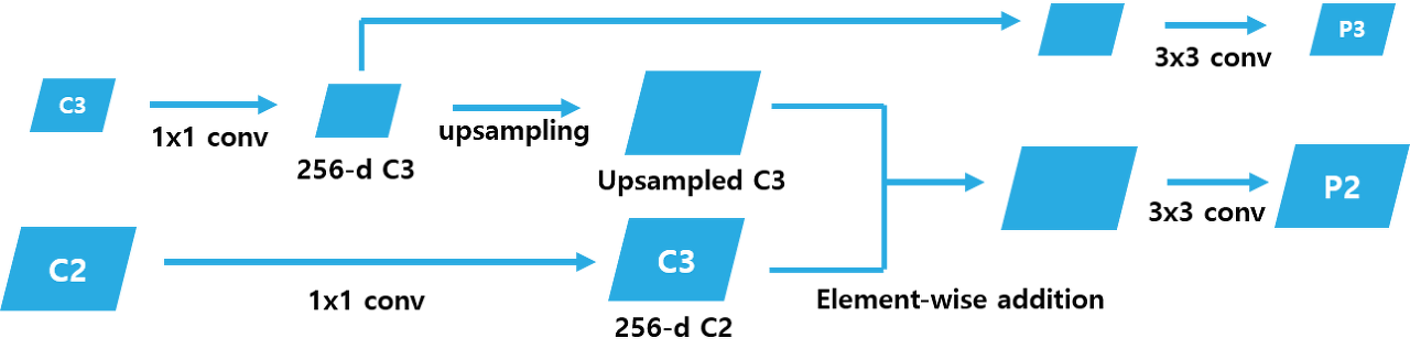 이 때 {c2, c3, c4, c5}는 {p2, p3, p4, p5}로 변환된다. 이 때 c2 같은 경우 아래층이 없기 때문에 그대로 1x1 conv 연산만을 거치고 p2를 얻는다.