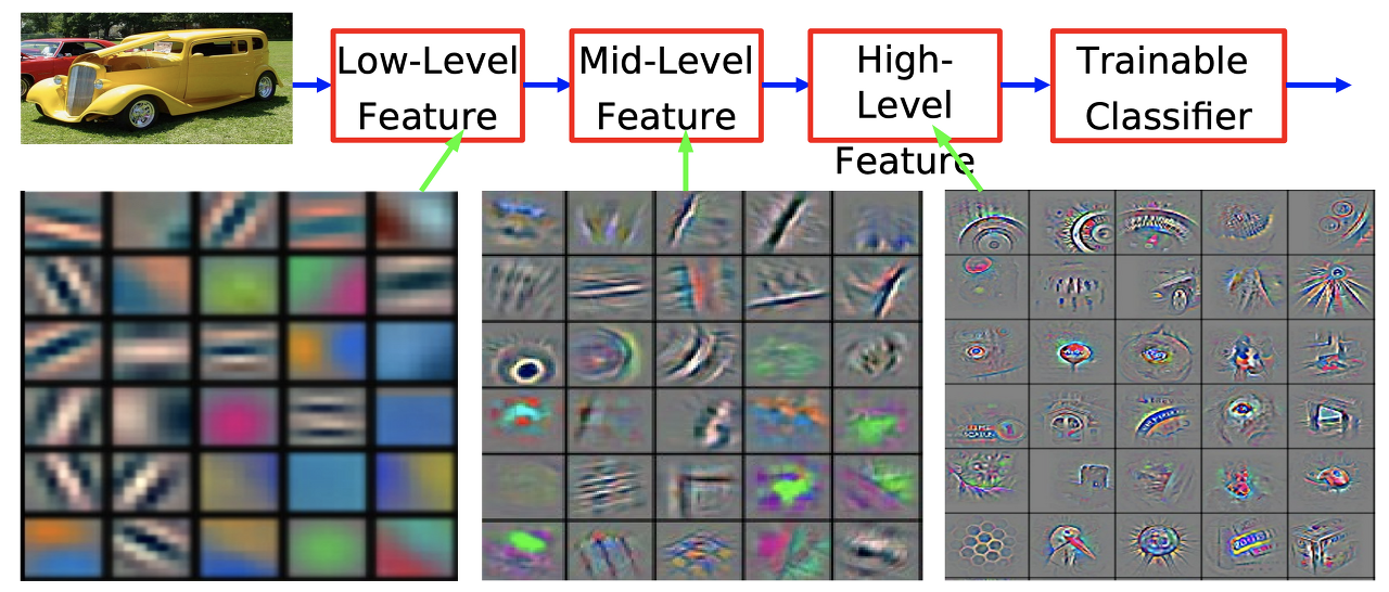convolutional network에서는 입력층에 가까울 수록 feature map은 높은 해상도를 가지고, 가장자리, 곡선 등과 같은 Low-level feature를 보유한다. 반대로 더 깊은 층에서 얻을 수 있는 feature map은 낮은 해상도를 가지며 질감과 물체의 일부분 등 class를 추론할 수 있는 high-level feature를 가지고 있다.