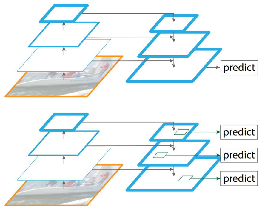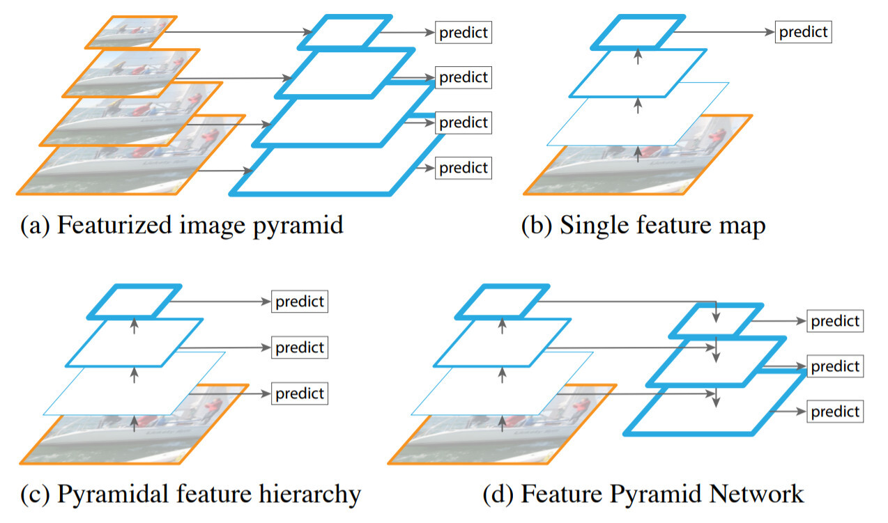 a~d 이외에 d와 유사한 방식인 (e)는 FPN이 등장할 시기의 최신모델들이 사용한 방법인데, FPN과 비슷하게 top-dwon방식을 이용하고 feature map을 연결시키기 위해 skip connection을 사용하지만 마지막 stage에서만 predict를 수행한다는 차이점이 있다.