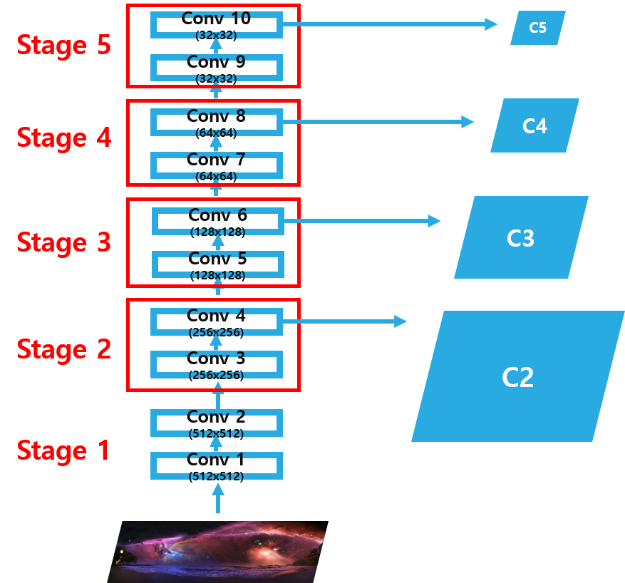 Bottom-up pathway 과정은 network의 forward pass 시 2배씩 작아지는 Feature map을 추출하는 과정이다. 이 때 각 stage 마지막 Layer의 output feature map을 추출한다. 논문에서는 같은 크기의 feature map을 출력하는 layer는 같은 stage에 있다고 정의하는데, 같은 stage 내에서는 마지막 layer(깊을 수록)가 더 강력한 Feature를 보유해 이를 pyramid level로 지정하기 때문이다.