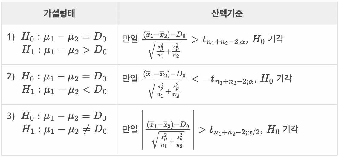 또한 기각역을 구할 때 두 집단의 자유도를 더해 줘야 하는데(통합분산추정량의 분모), 이는 기각역을 1개만 만들기 위해서다. 자유도를 따로따로 계산하면 기각역이 2개가 생기기 때문이다.