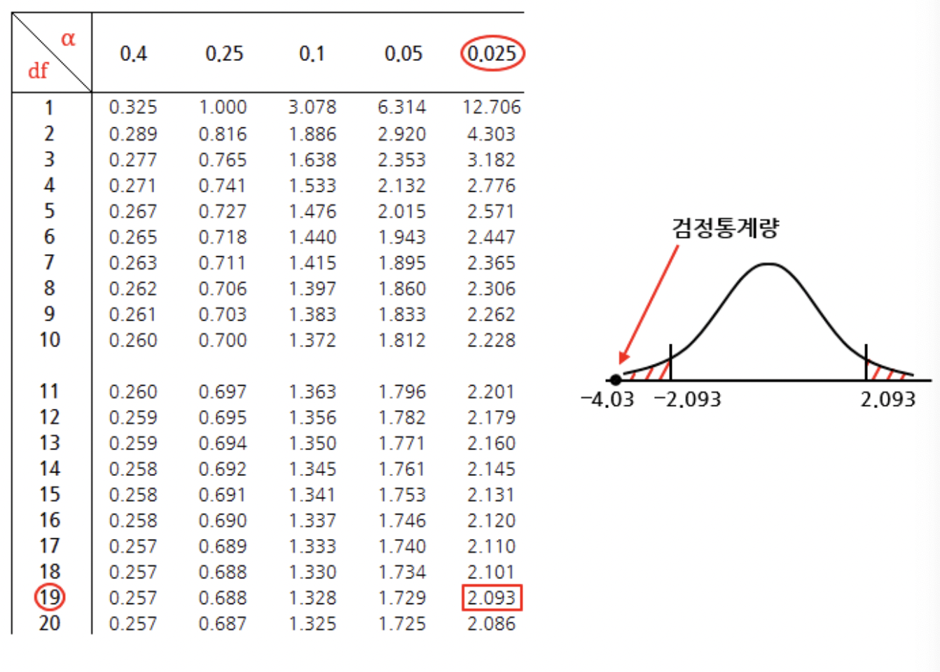 print(f"임계값 : +-{cv:.3f}, 검정통계량 : {tstat:.2f}")
