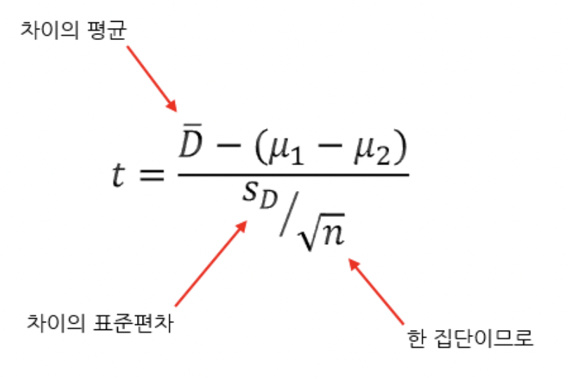 여기서 두 평균의 차(u1-u2)는 실험 전 후 차이가 나는지에 대한 가설에 따라 들어가는 값이고, 나머지 통계량(표본으로 부터 추출)은 실험 전 후의 "차이" 또한 "변화량"이므로 하나의 값들만이 들어간다.