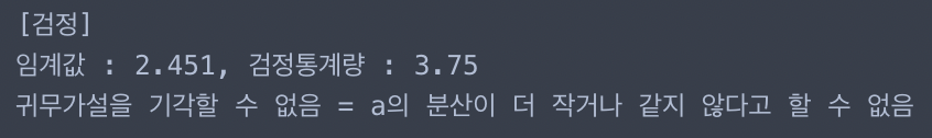 print('귀무가설을 기각하고, 대립가설을 채택함 = a의 분산이 더 크다고 할 수 있음')