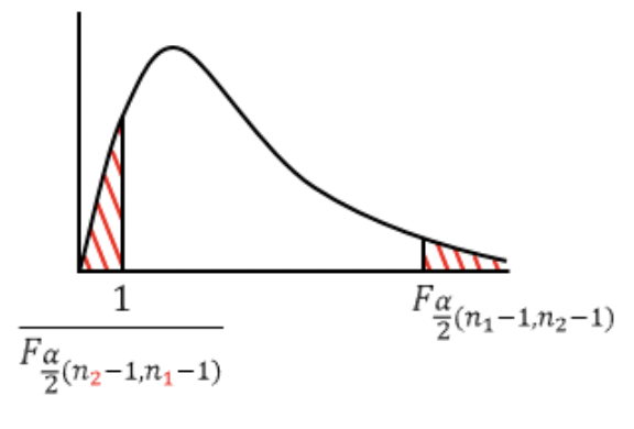 또한 F분포표를 통해 검정통계량과 기각역을 구할 때, 왼쪽 기각역을 구할 경우 자유도가 바뀌며 추가적으로 F에 역수를 취해줘야한다.