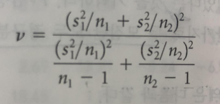 이 경우 위와 같은 식을 통해 검정통계량을 계산하는데, 정규분포와 t분포를 따르지 않고 특정한 자유도를 지닌 t분포를 근사적으로 따른다고 한다. 해당 자유도는 다음과 같은 식으로 구한다.