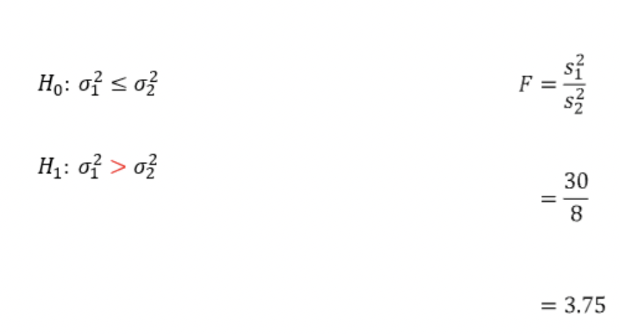 ex) 동일한 회사의 공장 a, b에서 생산하는 제품의 생산량의 분산은 같거나 a가 더 작은 것으로 알려져 있는데, a 공장의 생산량의 분산이 클 수 있다는 의견이 나오고 있어 실제로 어떠한지를 알아보기 위해 각각 표본 6개와 12개를 뽑은 결과 표본분산이 각각 30과 8이 나왔다. a 공장의 생산량의 분산이 더 크다고 할 수 있는지 유의수준 10%에서 검정하시오.