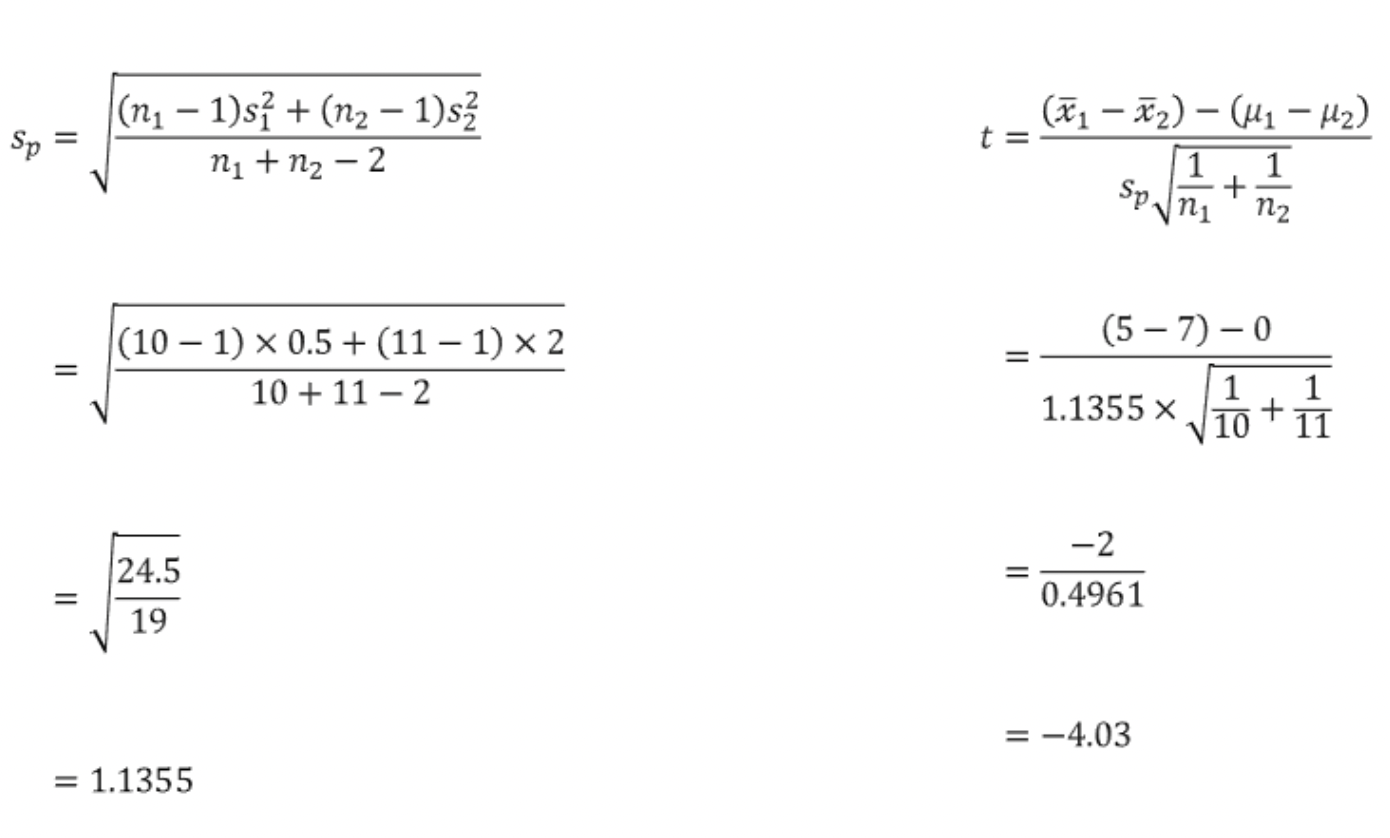 이 때 t 검정통계량을 계산하는 방식은 Z 검정과 유사한데, 단지 두 집단의 모분산 대신 통합분산추정량을 사용하면 된다.