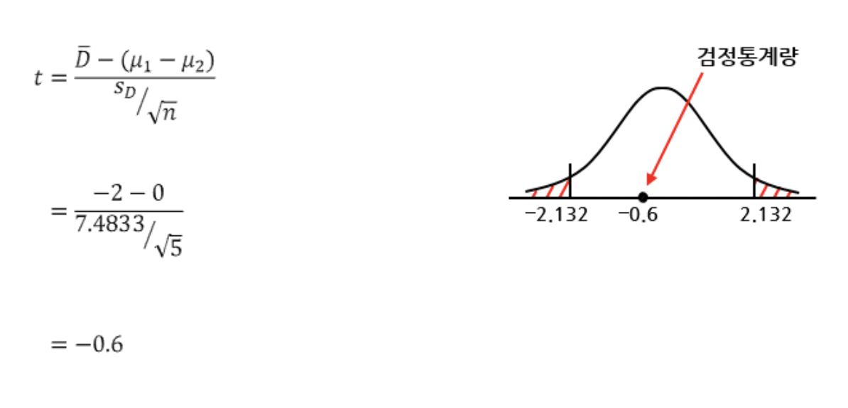 교육 전 후 차이의 평균은 -2, 차이의 표준편차는 7.4833으로 나왔다. 해당 값들을 통해 검정통계량을 계산하면 -0.6이 나온다. 유의수준 0.1과 자유도 5-1=4에서 임계값은 +-2.132이다. 검정통계량이 채택역 안에 위치하므로 귀무가설을 기각할 수 없다. 따라서 "수업을 한 전 후 성적의 차이가 있다고 할 수 없다."