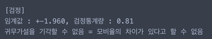 print('귀무가설을 기각할 수 없음 = 모비율의 차이가 있다고 할 수 없음')